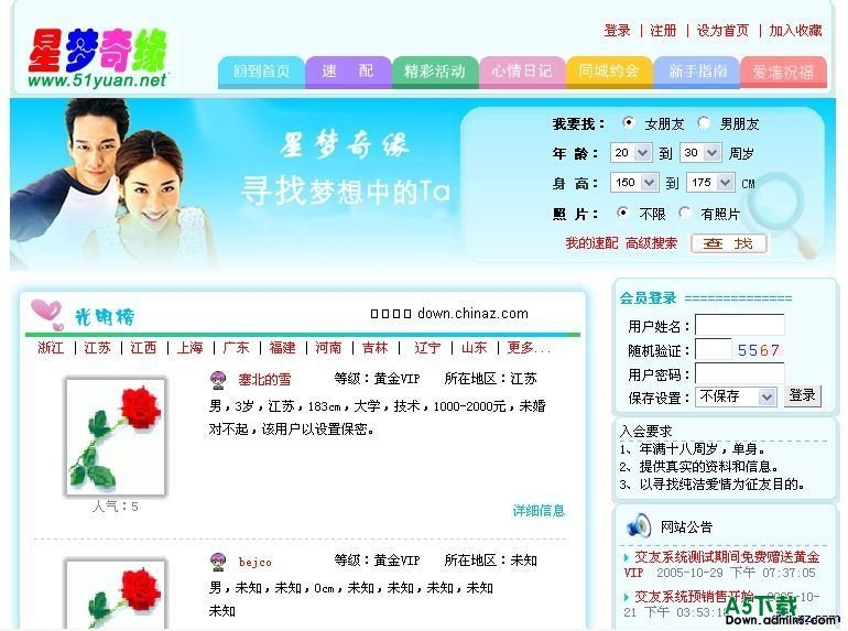 本程序为大型交友网站,模仿世纪佳缘网站,界面友好,内容丰富,功能强大。