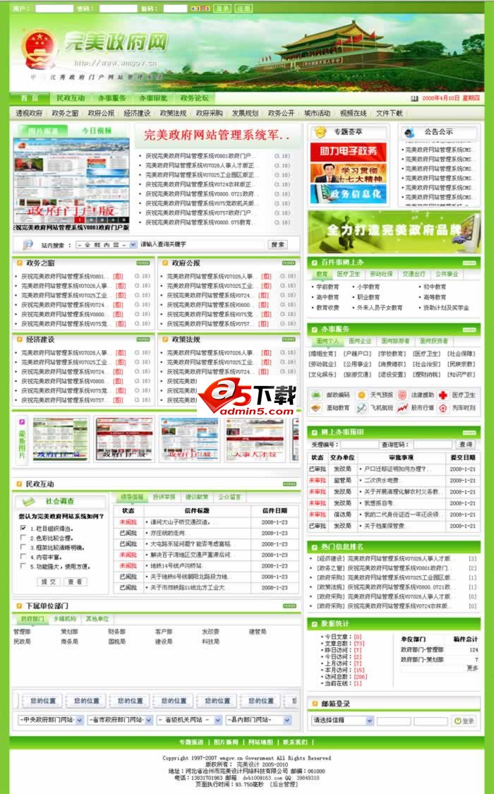 完美政府网站管理系统 WMCMS0801县市政府功能增强版。此版全站采用DIV+CSS构建,静态生成,使网站速度加快,网站更容易维护,搜索引擎更容易收录达到推广的效果。 优化了程序代码,修复以前版本存在的问题,功能模块加强。此版本完全按市县政府门户网站的功能需求进行定向开发设计,网站根据《中华人民共和国国务院令第492号》要求集成了政府信息公开功能模块,同时按《政府门户网站考核评公办法》集成政民互动功能模块(领导信箱、建言献策、投诉举报、公众留言等)、百件事网上办功能模块、办事审批功能模板、图文媒体视频功能、公文发布、哀悼日一键设置功能、政府领导等功能模块,满足政府门户的需求。设计中采用大气的中国红色调辅以清淡色块处理,使网站整体庄重稳健又不失活力。网站系统为CMS智能内容管理平台,栏目及菜单后台设置,操作便捷,会打字就会建站,同时随正式版提供丰富的PSD源图及FLV源文件,方便进行二次设计。
