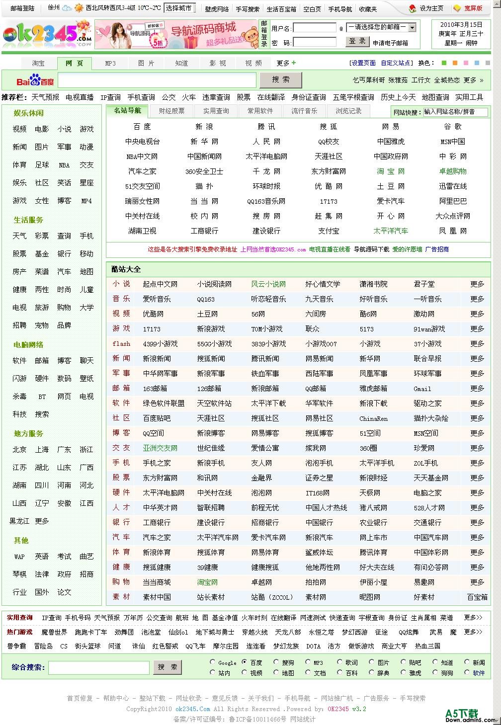 ok2345网址导航 v3.2版 功能强大,智能建站系统,只要五分钟,一个拥有网址导航专业网站就会呈现在你的眼前;不需要庞大空间、不需要高带宽;一个普通的虚拟空间就可以迅速搭建起一个内容丰富的 漂亮的网址导航,使你的建站成本低至极点;只要会HTML就可以做出个性化的网站,最大限度保障站长利益,我们的服务理念贯穿于整个程序使用过程,并保证客户在每一个环节都能轻松应付、每一个难题都轻松搞定。