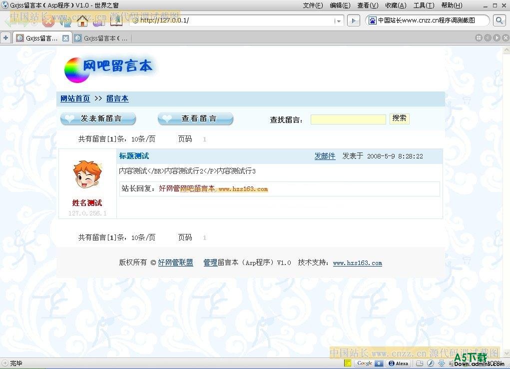 2、程序功能:发布留言,查看留言,查找留言,验证码功能(有效防止垃圾留言),IP地址记录,对留言进行回复处理,删除操作,后台修改管理员密码(密码MD5加密,不可破解),数据库防止下载。