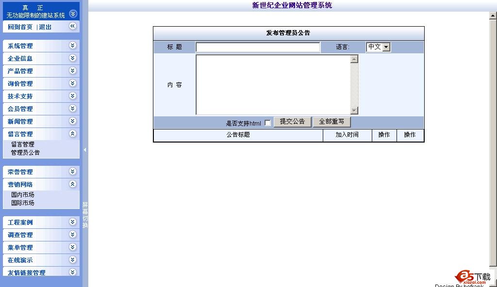 一、系统管理:管理员管理,可以新增管理员及修改管理员密码;发布网站公告;进行网站配置;网站统计和数据库备份,为保证您的数据安全本系统采用了数据库备份功能;上传文件管理,管理你增加产品时上传的图片及其他文件。