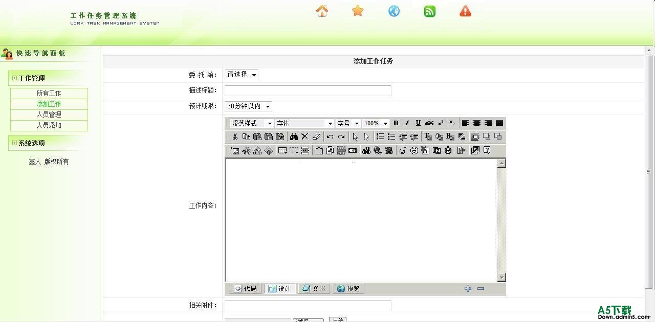 一个小型的工作、任务管理系统。 公司领导通过该系统分发工作和任务,查看工作任务进行状态、完成情况、统计数量等。 系统支持各种常用文件上传,工作提醒邮件发送等等。 它是一个内部使用的小系统,目前只是满足了初步使用。