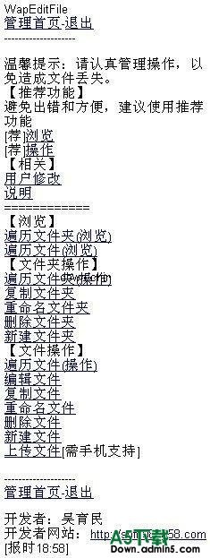 功能:手机或电脑上网, [针对文件夹]功能:浏览、复制、重命名、删除、清空、新建等功能 [针对文件]功能:浏览、编辑、复制、重命名、删除、新建、上传文件等功能 本软件采用ASP语言+ACCESS数据库开发。如果您在使用过程中遇到软件问题或建议,请联系开发者吴育民,以便让软件更加完善。 默认管理员用户名:admin 密码:admin
