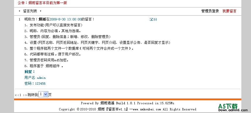 1、发布功能(用户可以直接发布留言) 2、昵称、内容为必填,其他为选填。 3、管理员(回复、删除信息;新增、修改、删除管理员) 4、设置(网页名称、网页返回地址、网页关键字、网页介绍、设置显示公告、是否回复才显示) 5、整个程序就两个文件一个数据库(可将两个文件合并成一个文件)。 6、代码都带有注释,便于用户修改。 7、管理员密码采用md5加密。 8、程序基于 烟雨组件 。