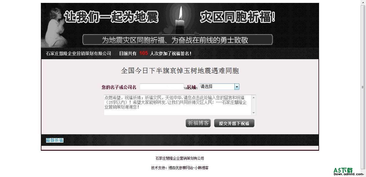 这些天为灾区人民所受灾难而心疼,为我们的“铁战士”及所有参与救援的人们而感动,改了这个小程序,目的在于让更多的爱国网站都能挂上这个小程序,为大地震逝者致哀,为灾区生者而祈祷祝福。