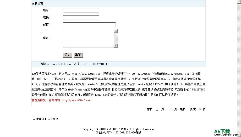 1、留言内容需要管理员审核后才会在前台显示 2、支持多个管理员管理留言本 3、自带友情链接管理系统 4、可以任意修改后台管理文件夹,默认为:admin 5、系统默认的管理员用户名为:admin 密码:123456