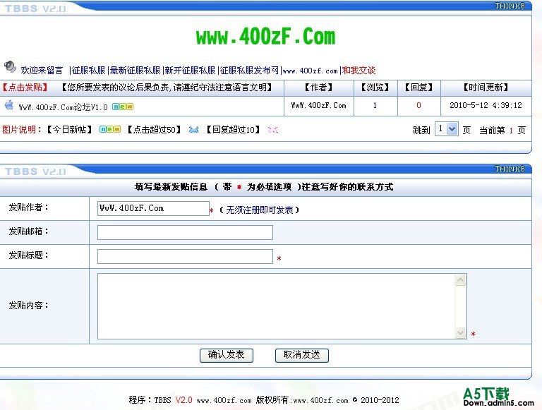 特别提醒: 本程序力求简洁大方,顾没有设后台管理,管理员只有删贴功能,即点中要删除的帖子,然后在弹出窗口中输入用户名和密码即可。