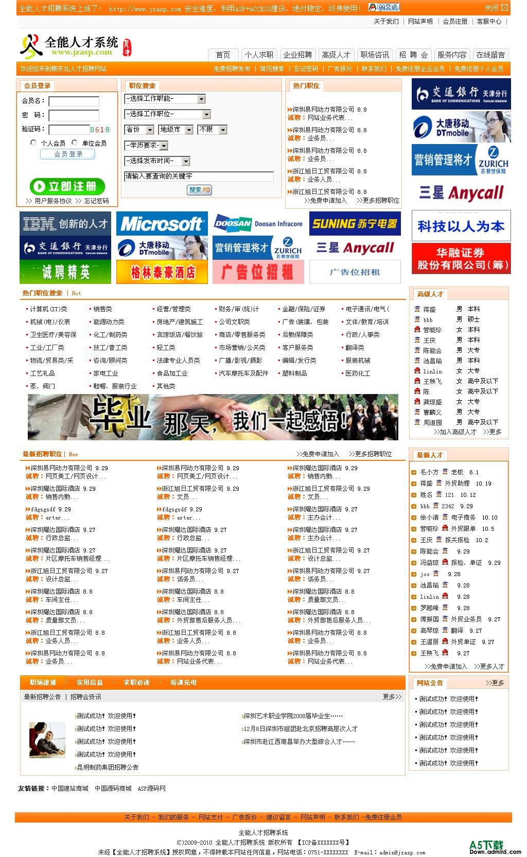 个人求职,企业招聘,高级人才,职场咨讯,招 聘 会,服务内容 在线留言,免费招聘发布,简历搜索,免费注册企业会员,免费注册个人会员 后台地址:admin/Login.asp 帐号:admin 密码:admin