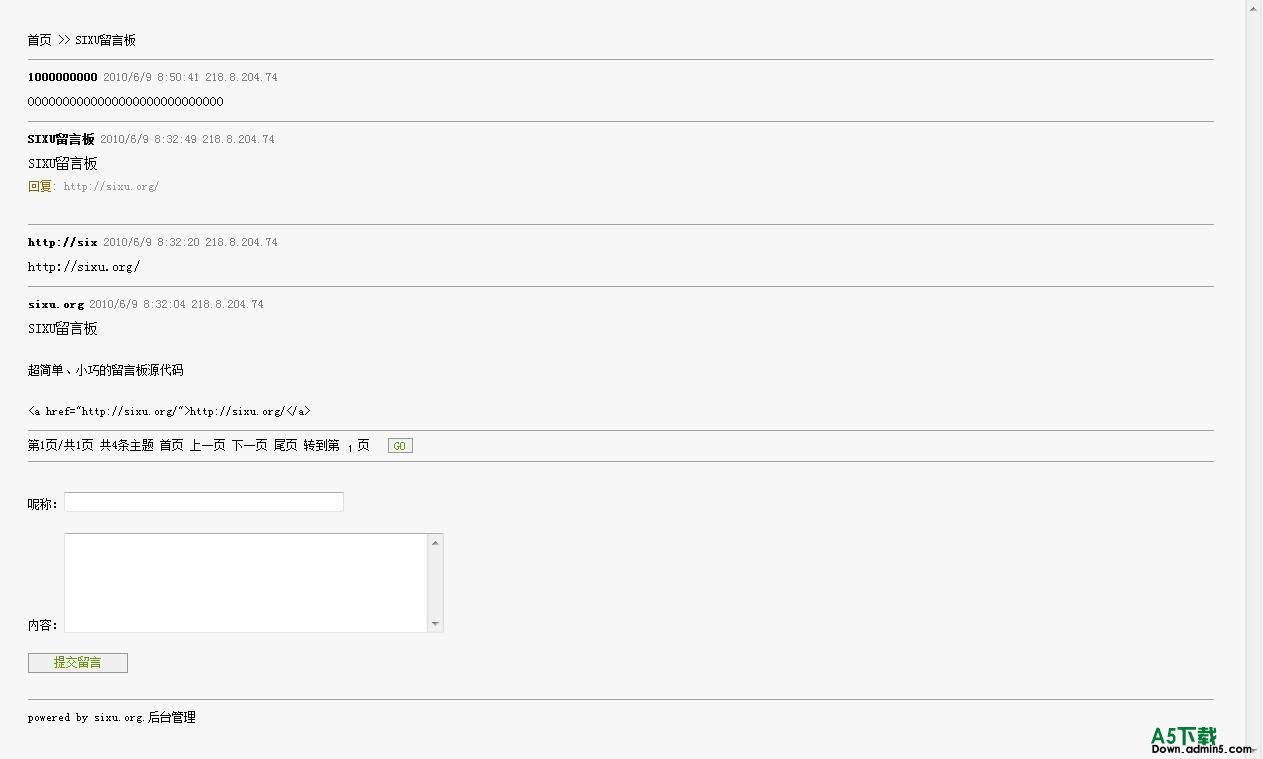 SIXU超简单小巧的留言板V1.1 v1.1 最要是加了留言验证码,没有验码确实很难使用,垃圾太多 禁止外部提交。 其他没有改动,下次加入过滤。 SIXU留言板 超简单、小巧的留言板源代码 有回复功能,可记录留言者IP 防注入,过滤链接等都有 管理账号和密码: admin