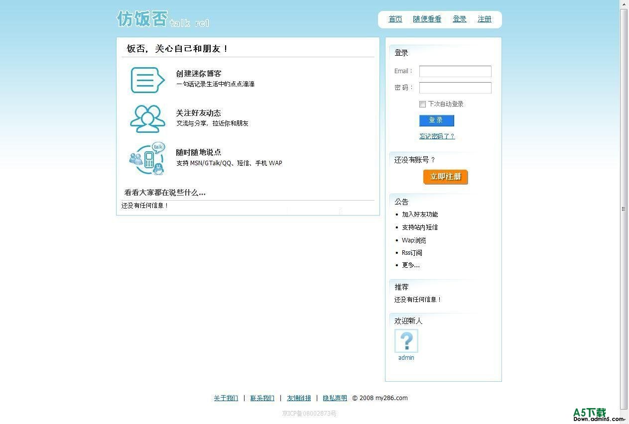 更新 1、修正3.0版本的已发现BUG 2、增加添加好友,删除好友功能; 3、添加站内短信功能; 4、程序精简和优化; 5、其他...