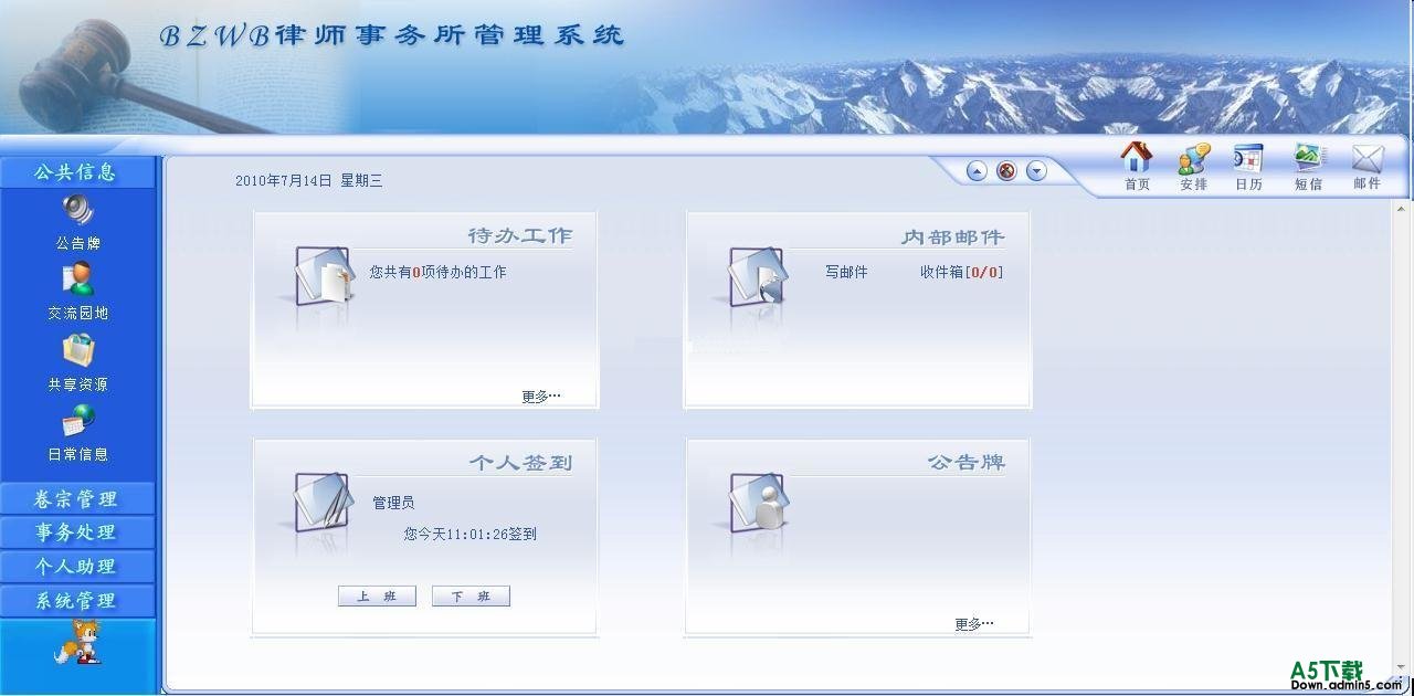 BZWB律师事务所管理系统(Lawyer),包含了案件管理功能、案件财务管理、卷宗文档管理、案件分析讨论、案件联系人通讯录、案件活动记录与安排等功能,以上的功能都是与案件紧密关联起来,便于多个律师相互协助与交流。并具有强大交流园地与文件共享功能,满足律师事务所日常的法律、法规、案件心得的交流与学习。在系统的首页面中用户显示与自己相关的信息,如个人邮件、通知、待办工作、签到信息等。同时还有实用日常功能:如事物申请(会议室、车辆、资金、休假、出差、报销申请等)、手机短信、通讯录、个人总结与计划等模块。后台管理功能有:账户管理、部门管理、公告管理、人事档案管理、会议室管理、车辆管理等。