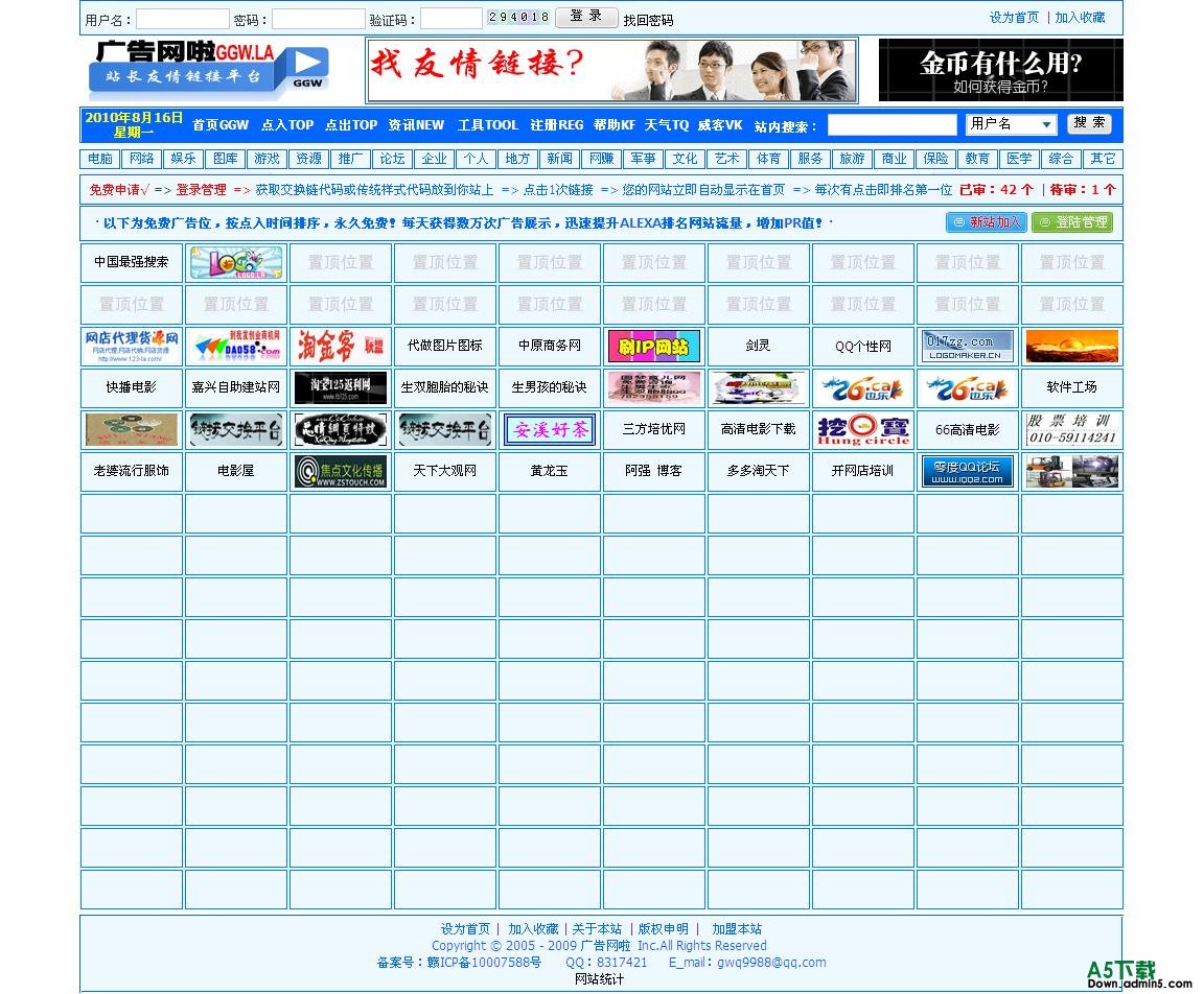 后台功能: 网站信息配置 网站公告设置 格子分类设置 网站管理设置 顶部图片广告 顶部文字广告 友情连接 注册用户管理 添加新用户 已审核用户统计 未审核用户统计