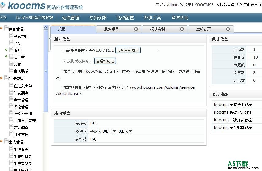 KooCMS网站内容管理系统是基于.NET技术开发的针对中小型网站建站需求开发建站工具平台,具有稳定的系统构架,良好的可扩展性,模板语法简单易 学,高效的模板解析引擎,优异灵活的插件机制,可以实现各种个性化交互界面,非常适合用于开发企业网站、政符门户网站、个人网站等各种类型的网站。
