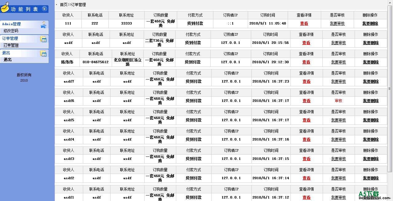 在线订购程序asp适合企业网站增加产品在线订购插件,也可作做成用户留言。 用户可提交的订购信息包括:收货人,联系电话,收货地址,订购数量,付款方式,联系QQ,备注信息等。 管理员可以在后台查看,审核,删除用户提交的订单信息,可以修改登陆密码。 后台路径:admin/index.asp 用户名密码admin
