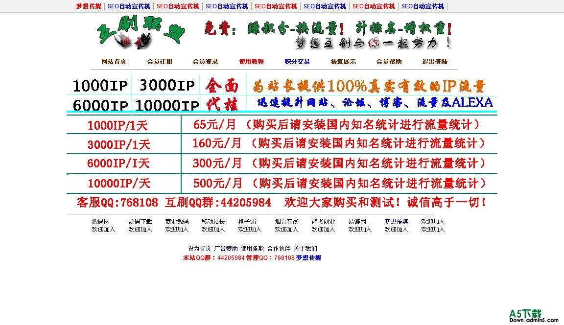 这是梦想站长互刷联盟网站整站源码,今天提别贡献出来给大家分享!我看很多朋友上当受骗的去购买这类源码实在看不下去,所以就把自己经营两年多的互刷网站完整版程序奉献出来。我的QQ:768108 使用中有任何问题请联系我。 演示地址:http://ip.mxcc.net 500人互刷QQ群:44205984 有了这个源码大家只要好好的推广几下,那么你的域名世界排名很快就会打破10万的记录.... 后台:/fengye 账号:admin 密码:admin