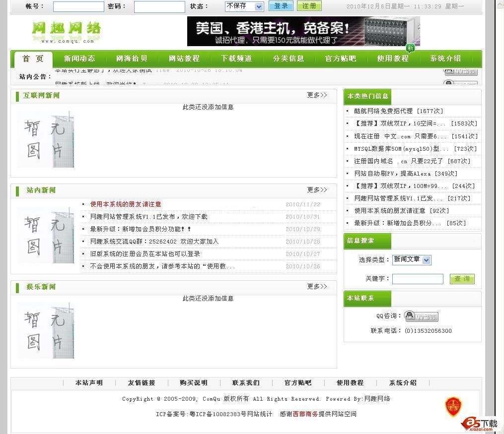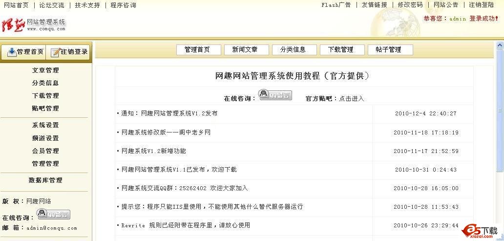 系统功能:新闻文章(二级分类)、分类信息(二级分类)、下载频道、贴吧、产品展示。