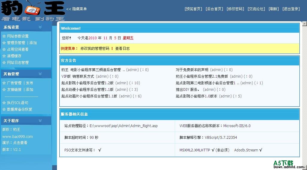 2.0版本说明: 1.采用缓存技术 促使程序能承受高访问量的同时还能让网站访问高速。 2.广告管理系统 3.友情链接系统 4.logo路径文件为 IMG/LOGO.GIF 5.使用用户请务必更改后台路径 6.全站开源