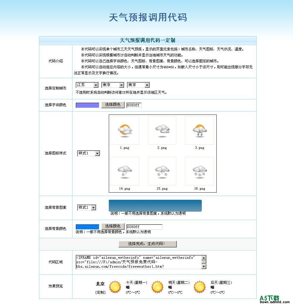 演示地址:http://tianqi.ailexun.com/freecode/ ( 数据都来源: http://www.weather.com.cn/ )