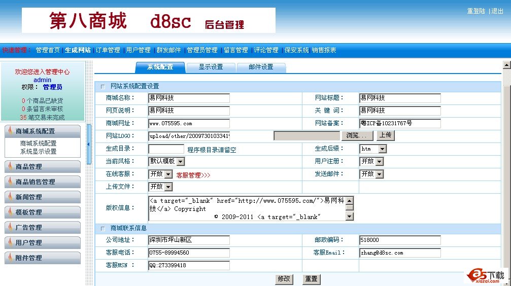 仿凡客商城推广联盟后台功能:商城系统配置,商品管理,新闻管理,新闻分类管理,模板管理,模板管理,广告管,用户管理,附件管理