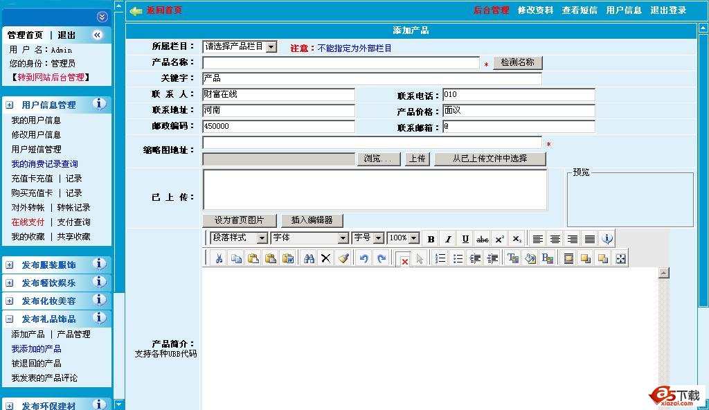内容包括文章、图片、下载、商城、供求,友情链接和留言等多个功能频道,一站注册,一站登陆,