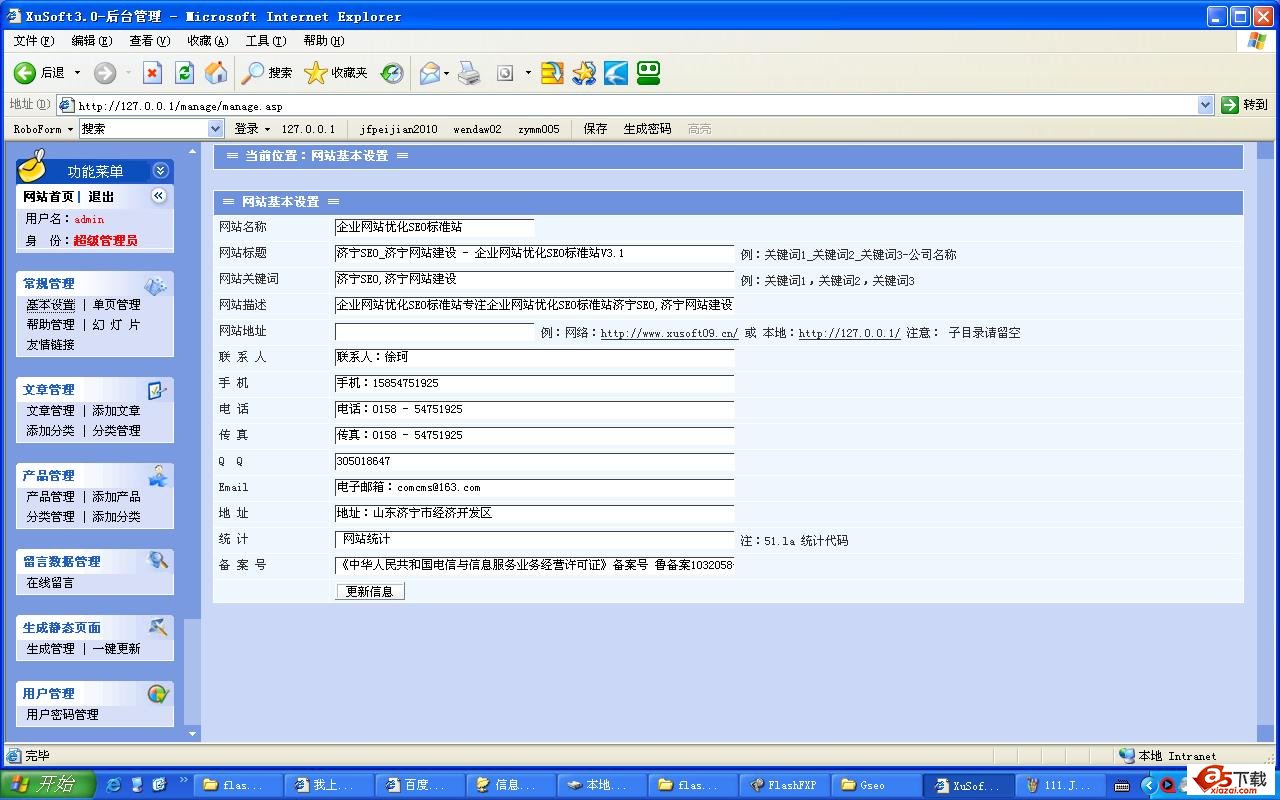 2、若上传至虚拟主机根目录则要修改文件(特别注意修改 网站配置中 网站地址 域名+“/” 如 http://www.xusoft09.cn/ 或本地测试 http://127.0.0.1/ 然后 点击生成静态化 因为本站专注优化网址是绝对路径利于搜索引擎抓取)注意:子目录下可留空