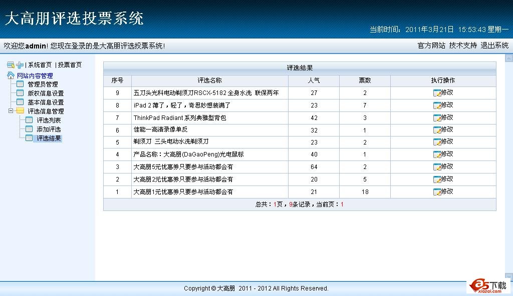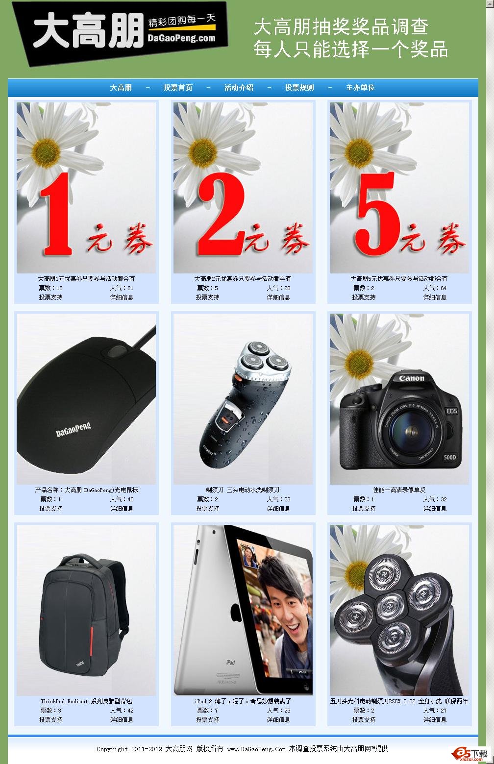 此投票程序为使用ASP而写,把代码放在自己的某个网站下,既可以增加流量,同时你在完成一个企业客户的网站时,也可以方便的在客户网站上加入一段代码,即时显示为客户而定制的调查主题,可以同时为不同的客户添加投票。用户名:admin 密码:admin