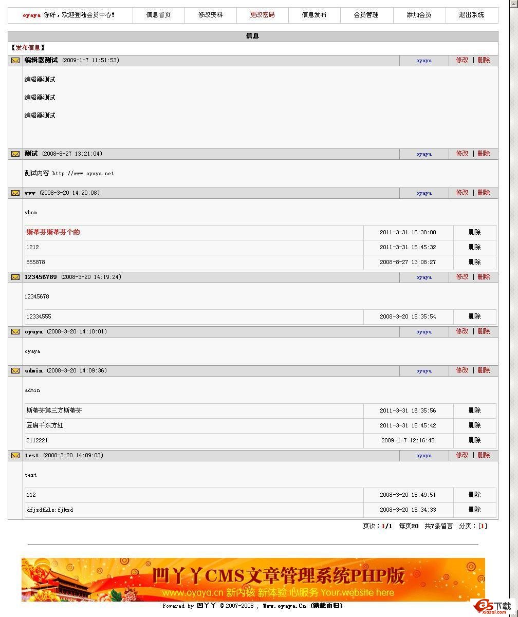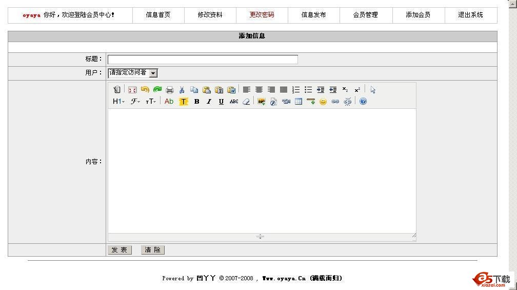 凹丫丫简单会员信息管理系统程序介绍: 简单的会员注册功能 后台会员管理 管理员发布简单的信息(可发给指定用户,可发给全部用户) 用户可对该信息进行留言 每个用户只能看到发给自己的信息 此代码仅共学习之用,请勿用与商业用途