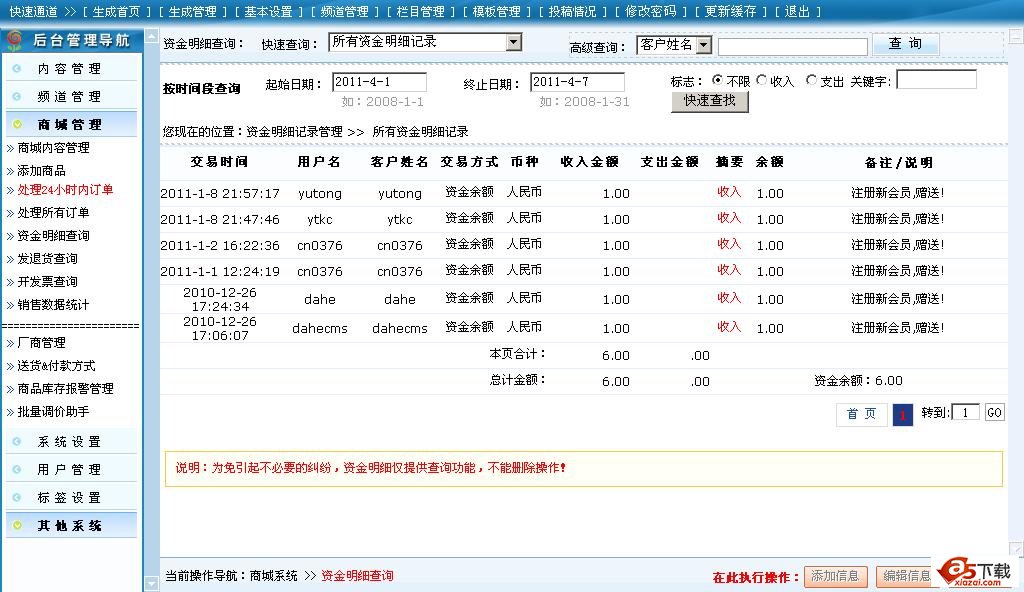 批量调价,商品库存报警,发退货查询,资金明细查询等,支持多级栏目分类。用户前台自行发布商品,后台管理员审核功能。