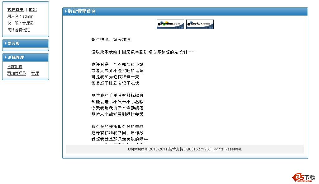后台功能: 网站首页浏览 留言板 留言管理 系统管理 网站配置 添加管理员|管理