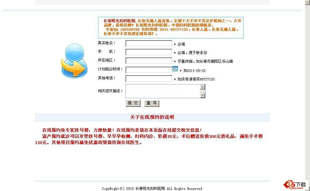 长春阳光妇科医院在线预约系统v1.0本程序适合基础用户用来做简单修改,请关注后期长春阳光妇科医院在线预约系统各类版本。