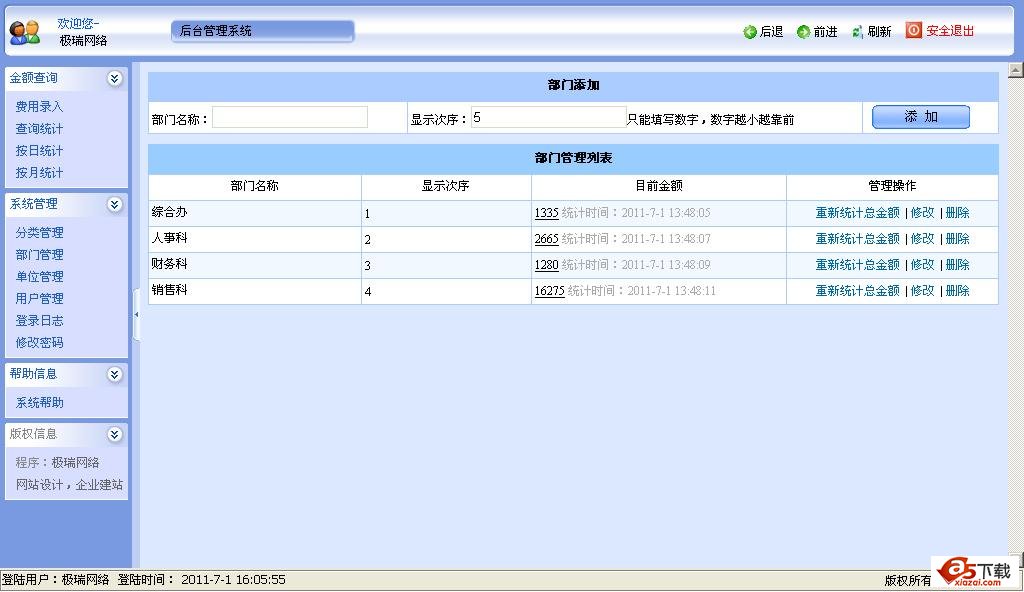 改版为演示版,与完整版的区别是没有多用户功能,没有综合比较统计功能,录入,搜索,修改密码,添加类别,部门等功能不受任何限制。