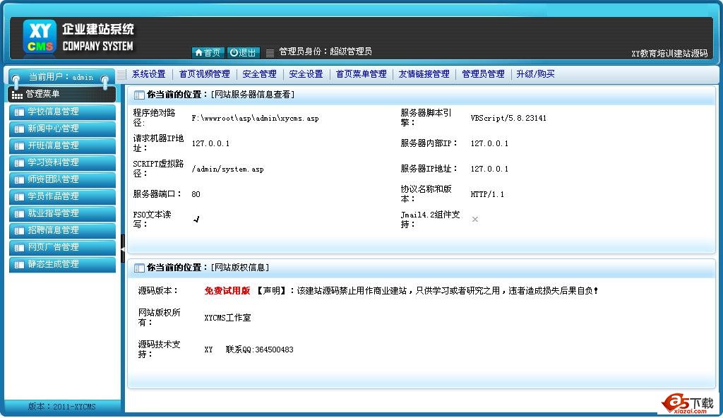 系统设置:进行系统相关基本信息设置,如网站名称,企业信息等基本信息。可以管理是否关闭网站,注册是否审核,留言是否审核