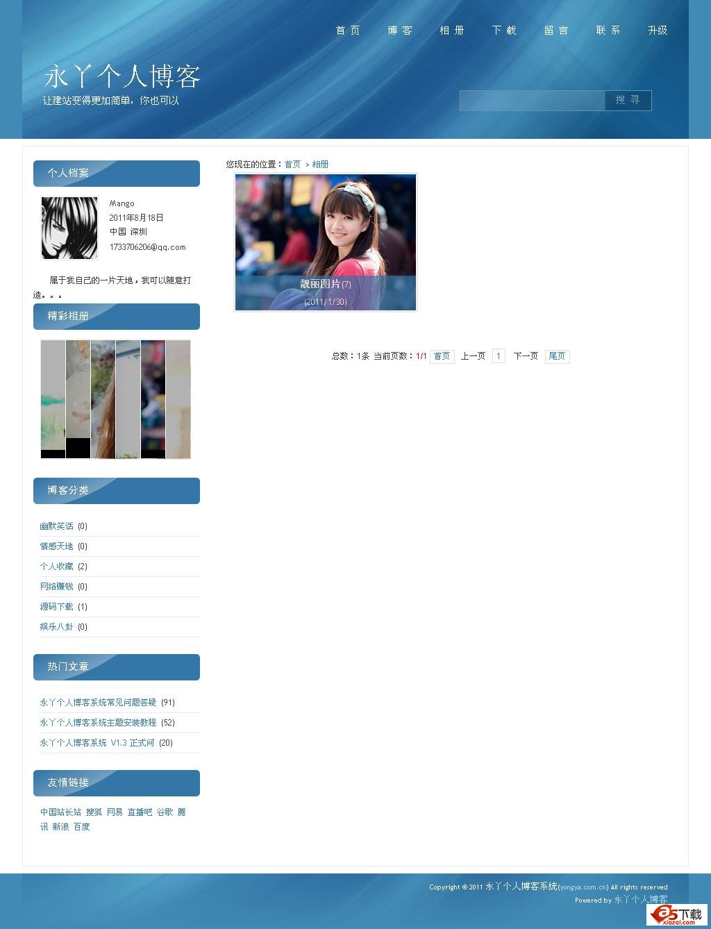您现在使用的是Mango开发的一套专门为你的个人博客系统——永丫(yongya)个人博客。该系统采用最流行的ASP+ACCESS进行搭建,页面使用DIV+CSS进行编写,全面兼容时下IE6、IE7、IE8、FIREFOX、360等主流浏览器。系统内置多款主题及精美相册,后台一键切换。前台所有内容均可以在后台进行修改删除等操作。