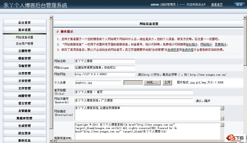 通过该系统建立您的博客或者是个人网站将变得轻而易举。不需要具备多么专业的网页设计知识,不需要对程序有多熟悉,仅仅下载永丫个人博客的源码上传到您申请的空间里,即生成了您的网站。接下来您要做的只是对网站的更新,写一篇文章,或是上传一张图片。将更多的精力用在宣传您的网站上,而不是建立网站。21世纪人人上网,人人有网站的时代,您不再无助,永丫愿助您一臂之力,携手共进!