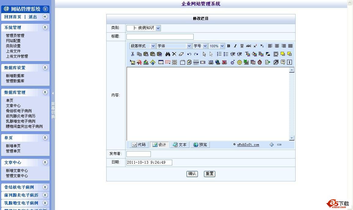 类别的设置:{系统管理->类别设置}使用的是无限级分类,只要在建立类别时{英文类别名=数据表名}即可,这里名字有问题以后改正。里面有案例大家看一下就知道怎么设的了。