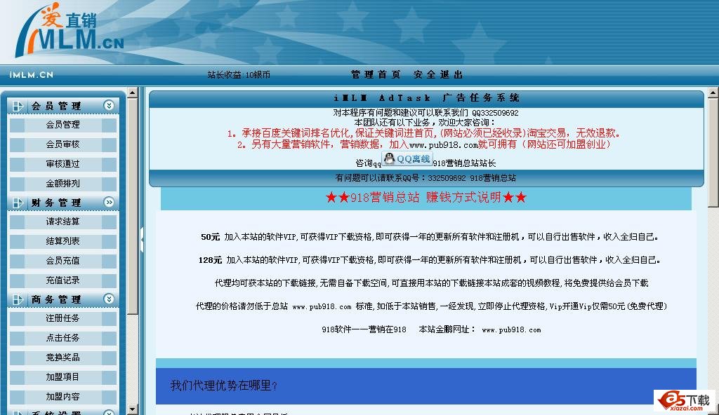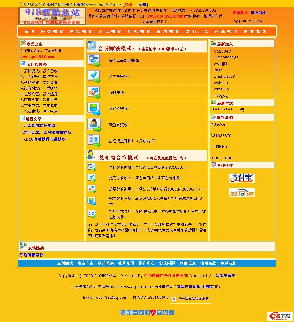 918网赚广告任务网系统后台功能也很完善,美工也不错。栏目有