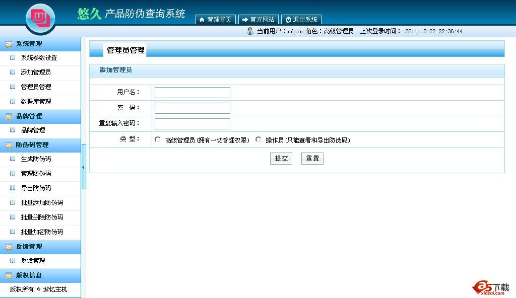 13.管理员权限分配:分高级管理员和操作员,高级管理员拥有全部后台管理权限,操作员只能查看防伪码和导出防伪码。