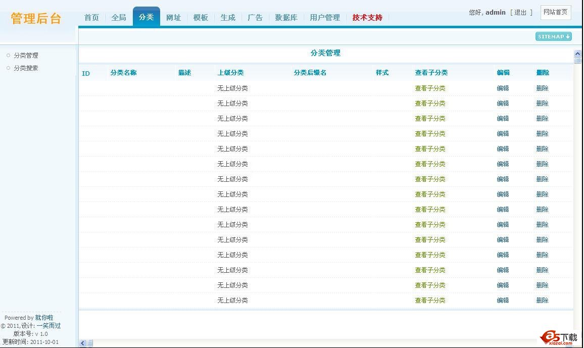 就你啦高仿hao123完美无错版V1.5 所有页面全完是后台控制,包括首页的名站控制,网站广告,还有网站导航控制,都已经在后台标明!分类网站全放在站点根目录html文件夹里面,如果无法生成分类请将这个目录设置成可写入(属性777)就行了!