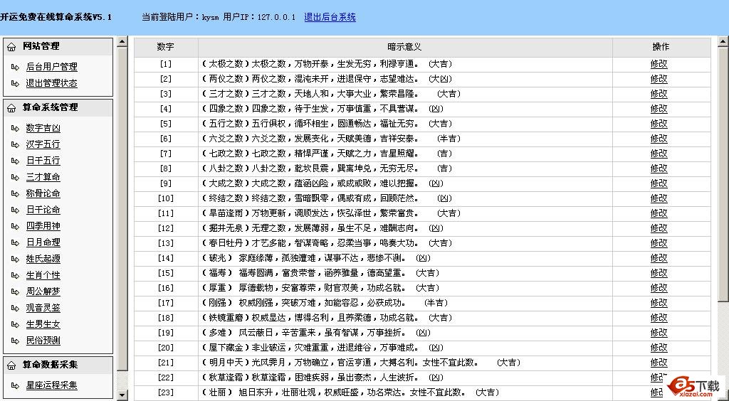 4、后台新增数字吉凶、汉字五行、日干五行、三才算命、称骨论命、日干论命、姓氏起源、周公解梦等14项管