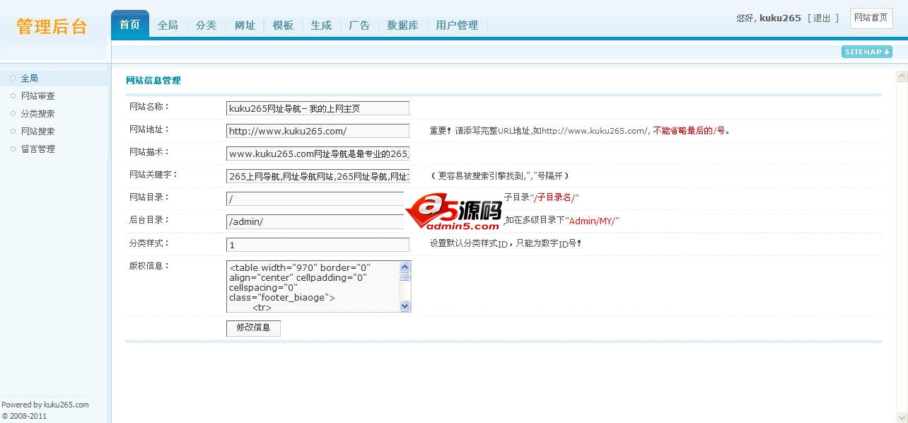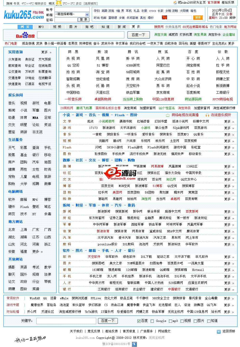 kuku265网址导航 v2.0更新同步了最新的数据,增加了广告连接的管理,更新修改了首页变形不兼容WIN7,美化了首页代码的整体优化。增加了广告JS代码管理、网址提交、网站留言、网址反馈等栏目。