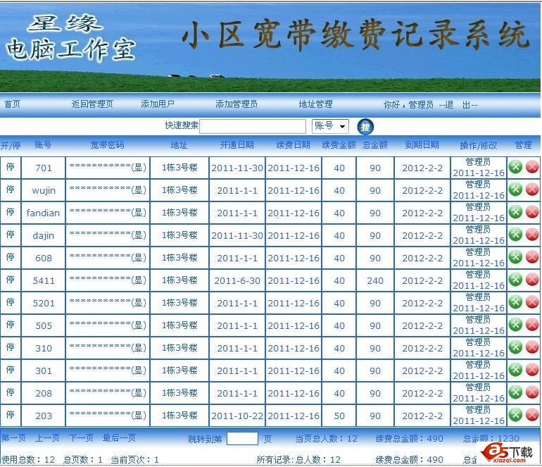 小区宽带缴费记录系统(asp)修正版,这个程序是给承包小区或者出租屋的朋友使用,有了这个就不用写在本子上,当初我也是写在本子上,觉得好麻烦。所以搞了这个程序,喜欢你们用得着,把程序直接上传到自己你的网站空间里。就可以使用了!后台文件是login.asp 用户名和密码都是admin。剩下就不多说了,自己摸索。