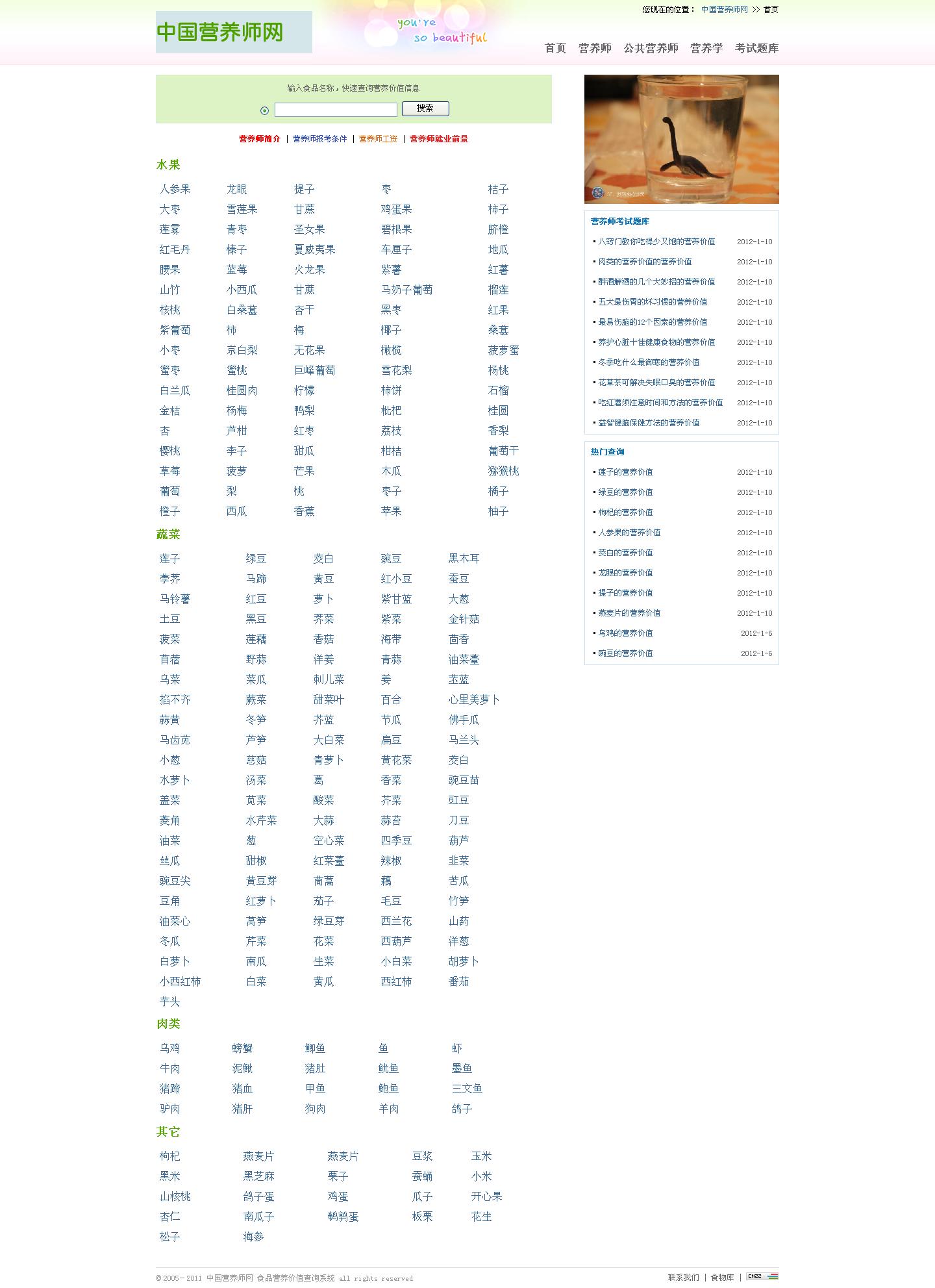 中国营养师网,是一个免费的食品营养价值查询系统,只要输入食品的名称,就能获取详细的食品的营养价值,成份,和食和功效和适合人群。