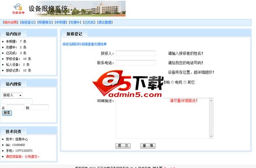 学校电教设备故障报修,由责任人或教师自行登记,总务在后台进行处理反馈。采用asp+access开发,在iis6/7 + xp +ie6/7/8/9 测试通过。