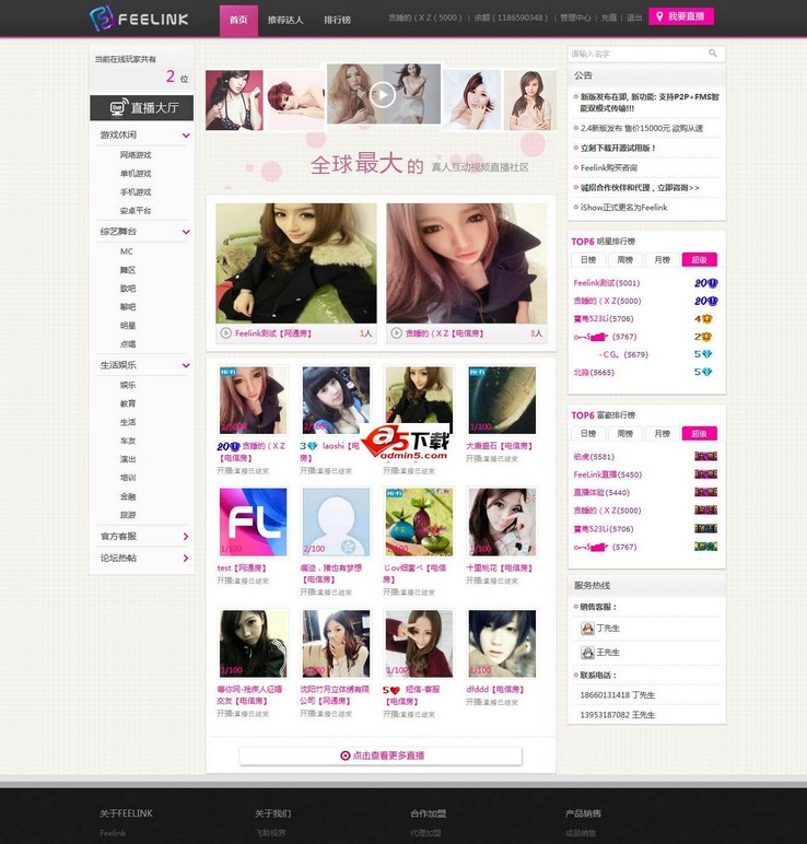 Feelink(ishow)是一款专注于p2p视频直播、网页视频直播以及视频在线直播网站系统,无需架设视频服务器,用户无需安装任何插件,即可实现超大型视频直播应用,快速架设如六间房,美女视频直播一样的网站应用。