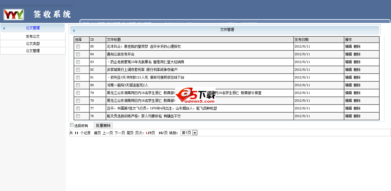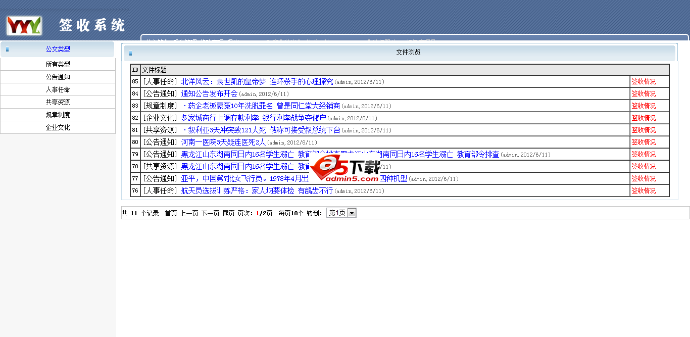 对其它单位的来文,未签收的文件系统都有标识提示,可打开文件进行签收,下载打印。对本单位的发布的文件随时监控接收单位签收文件的情况报表,包括未签收单位、已签收单位,签收时间等。