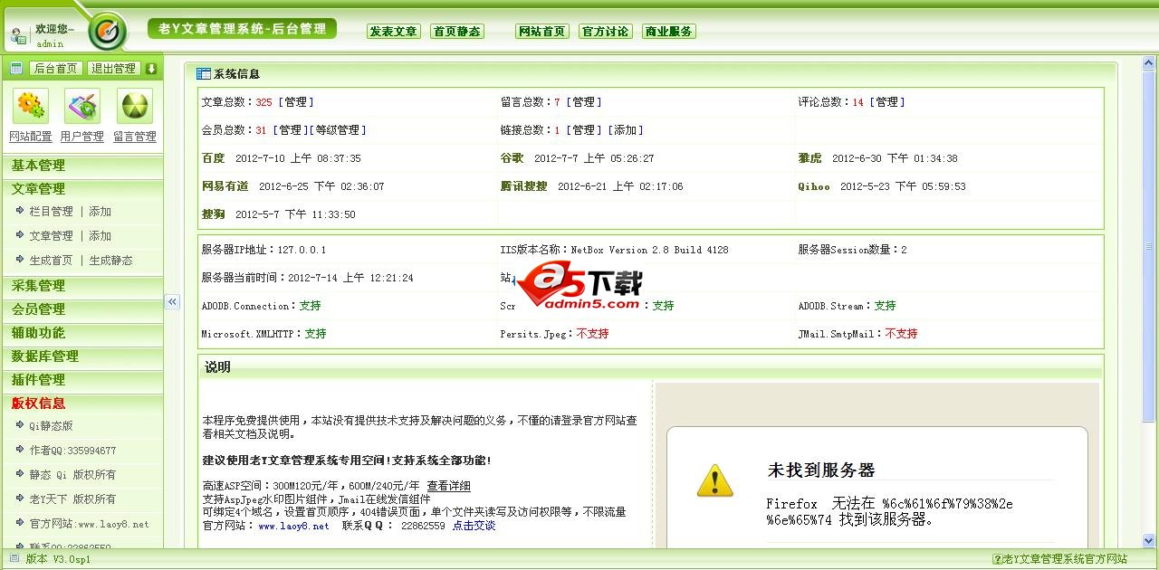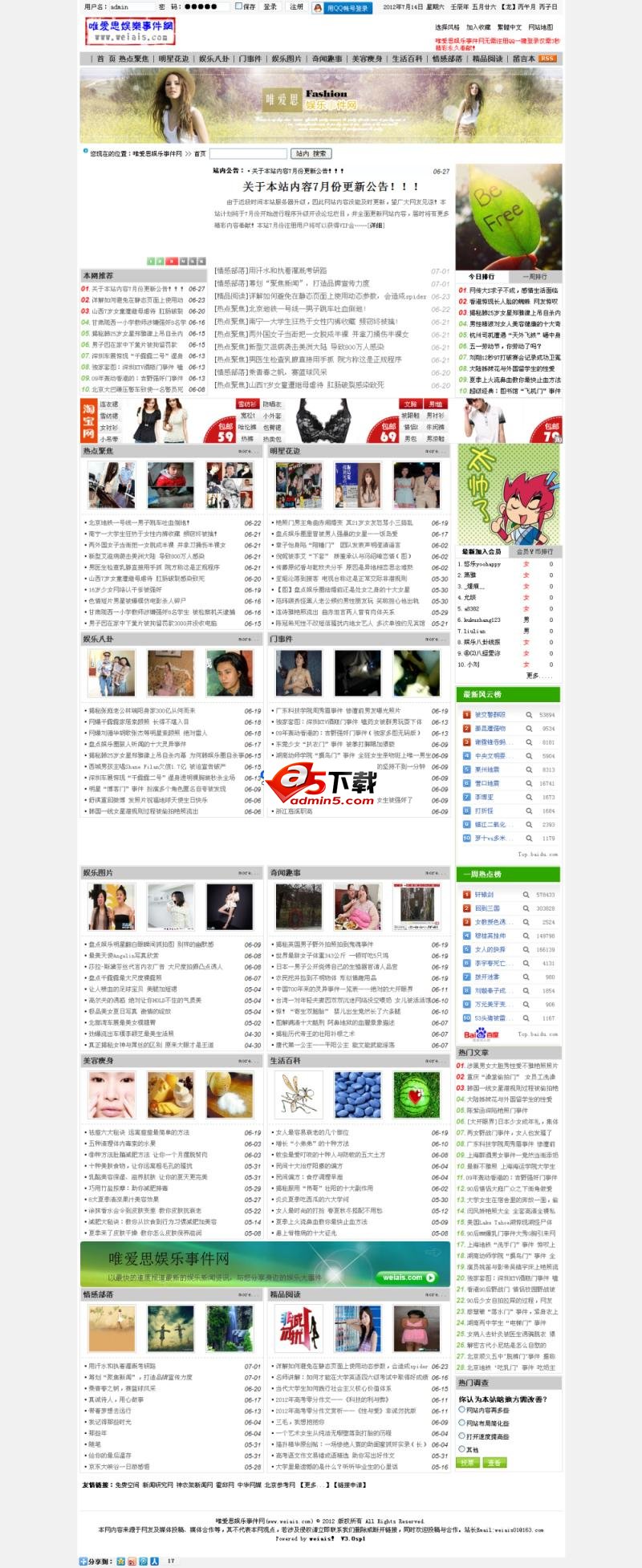 娱乐资讯新闻文章管理系统是老Y系统改版而来,本系统采用Asp+Access开发,适应中小新闻文章型网站及个人网站需求,整个网站采用Div+Css布局,IE6、IE7、IE8、Firefox、Chrome下测试无误。