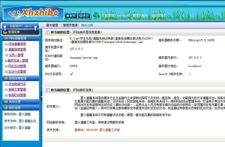 功能简介:主要功能有会员管理、管理员管理、直播发布、主持人管理、新闻管理、一帖多发、留言管理IP锁定、模版管理。