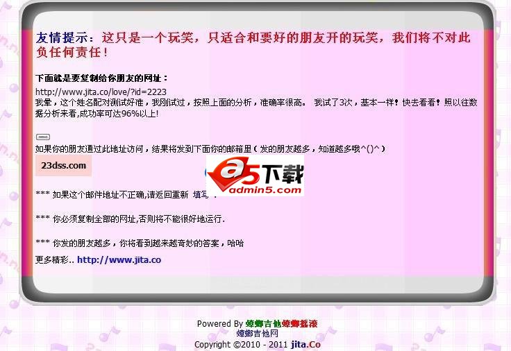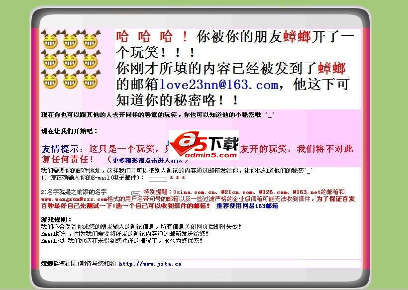 姓名配对爱情整人小程序 就是在网页输入姓名,后台就把这个姓名发送到指定的邮箱里面,这样你就能知道对方的小秘密了! 想知道你爱的人心里,有没有你? 想知道心中的他她到底爱着谁? 赶快,把这个姓名配对网站发给他(她),等他测试后! 你就可以知道他的小密码了哦! 安装方法很简单,直接上传网站任意目录即可,里面有详细的文件对应修改说明,如果还有什么不明白,可以微博联系我@谭腔北调