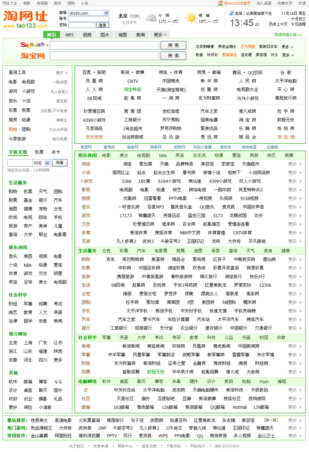 淘网址(tao123)淘宝网旗下网址导航,在大树的庇护下迅速成长,自从2010年上线至今跃身进入导航业前十,世界排名也进入了二千多位,引起多方瞩目,是名符其实的“太子”身份。淘网址的风格也进入千家万户,为网友所熟悉,是站长朋友们不可多得的收藏精品。