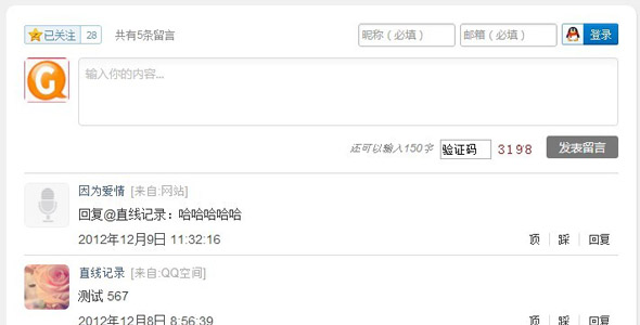 2、在【QQ登录】的情况下,会调用留言者QQ空间的呢称和头像,只要填写留言内容即可留言。